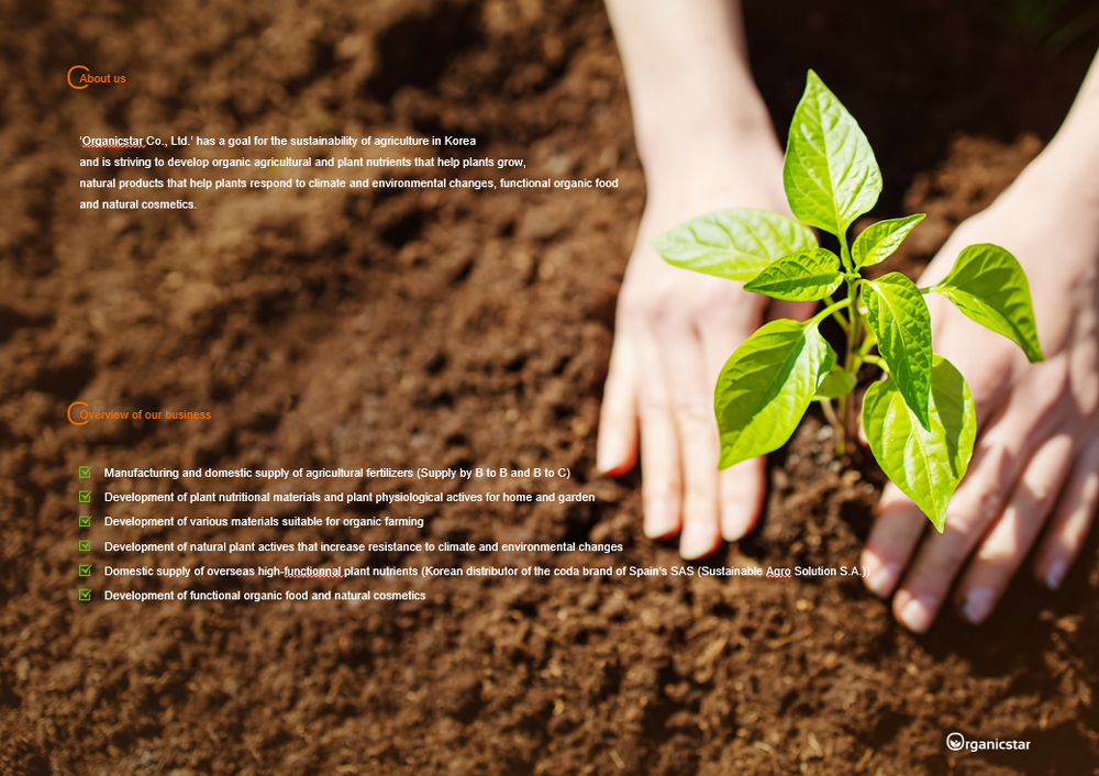 ‘Organicstar Co., Ltd.’ has a goal for the sustainability of agriculture in Korea and is striving to develop organic agricultural and plant nutrients that help plants grow, natural products that help plants respond to climate and environmental changes, functional organic food and natural cosmetics.